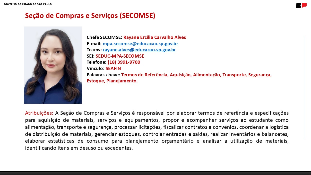 Chefe da Seção de Compras e Serviços (SECOMSE): Rayane Ercília Carvalho Alves