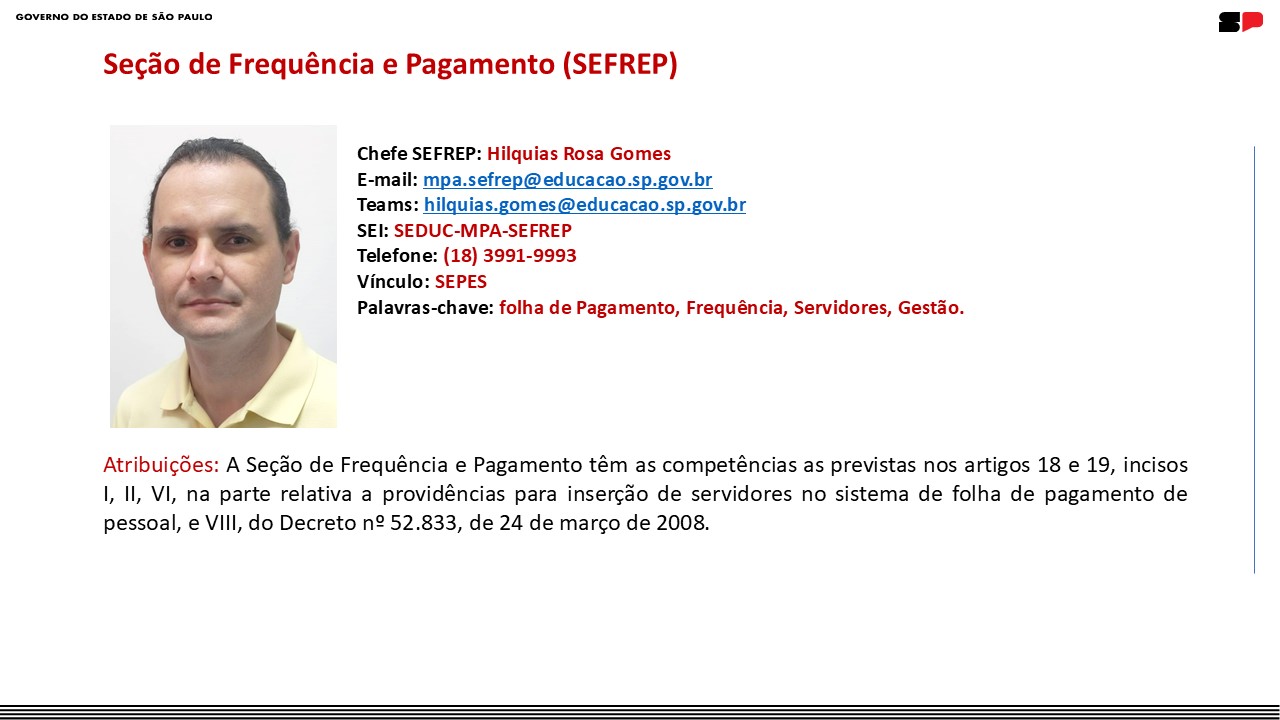 Chefe da Seção de Frequência e Pagamento (SEFREP): Hilquias Rosa Gomes