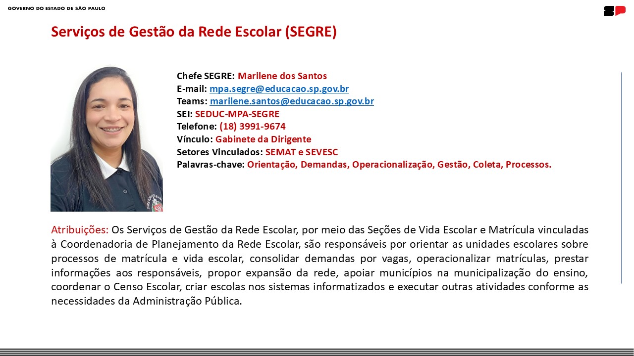 Chefe do Serviço de Gestão da Rede Escolar (SEGRE): Marilene dos Santos